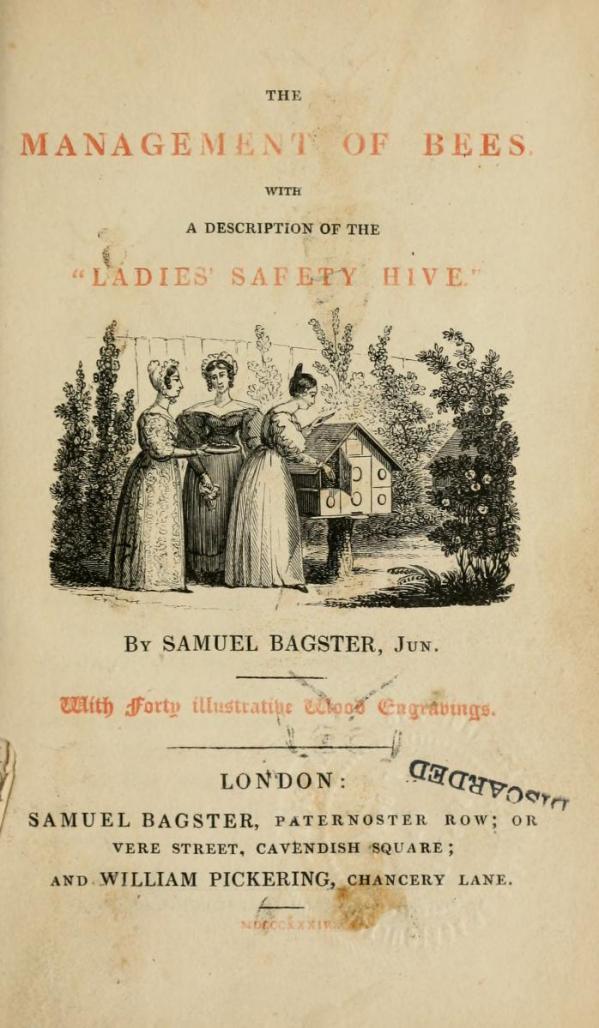 Samuel Bagster (1800 – 1835) was a printer and author, with a special interest in bees. His book The Management of Bees, with a description of the Ladies’ Saftey Hive (1834) describes the natural history of bees and discusses the current ideas of managing bees, with details of hive designs.