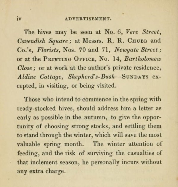 Bagster supplies detailed instructions for making the ladies’ safety hive, but it could also be bought ready made from a florist in Newgate Street, his company’s office in Bartholomew Close or, from his house in Shepherds Bush. Bagster would also deliver the hive, complete with bees.