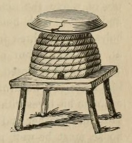 Bagster explains the disadvantages of the traditional straw hive, still used by cottagers. Although romantic, the thatched roof is impractical, soon rotting and letting in rain and pests; an upturned milk pan is seen as an improvement. Better still is the bee house, a painted wooden structure a bit like a cupboard with shelves inside to house a number of straw hives. Bagster observes