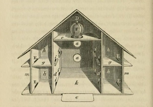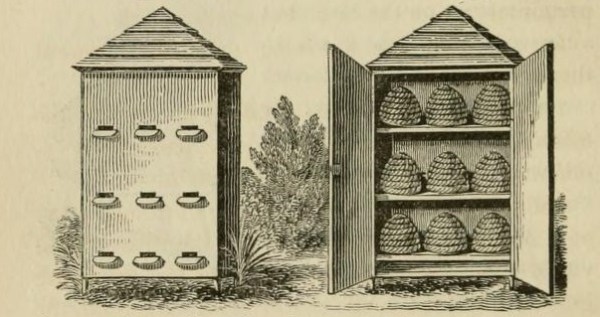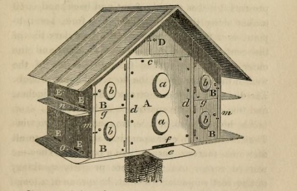 Amateur holders of bees, who prefer “the way their fathers trod,” have improved on the out-door exposure to wet and insects by putting their hives into a bee-house, which in some gardens, is a very ornamental object. The purse generally regulates the beauty. These houses are built about eighteen inches deep from front to back, four feet wide and six feet high with three shelves; and are capable of containing nine good sized hives, three in a row. The front is a fixture, perforated with nine holes opposite the places where the nine hives stand on the shelves; and before each hole an alighting board.