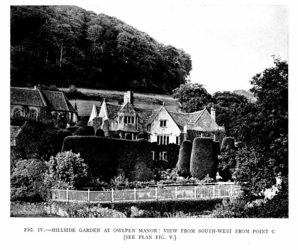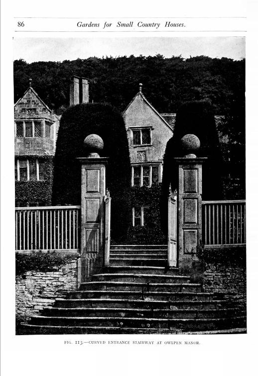 Jekyll identifies both medieval and Tudor gardens as inspirations for the ‘new’ gardens she and others were making in England at this time. Both Jekyll and Weaver admired the hillside garden at Owlpen Manor in Gloucestershire (now a hotel), an example of a formal garden where large, bold yew topiary and hedging are used to anchor the house to its surroundings.