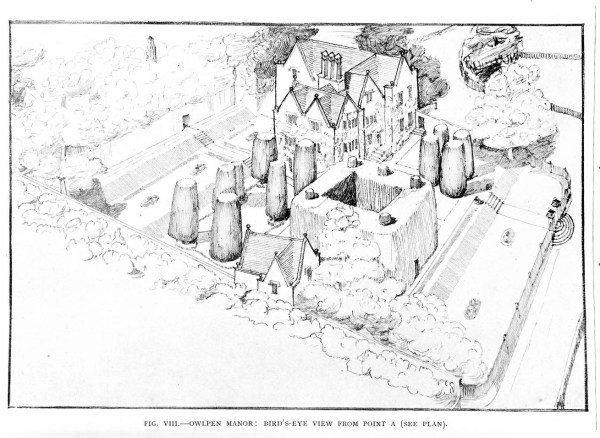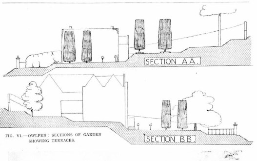 .. with what modesty the house nestles against the hillside and seeks to hide itself amidst regiments of yews. Great skill has been shown in their planting, for they emphasise the drops between the existing levels of the terrace, even though they partly veil them.