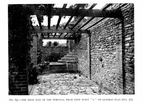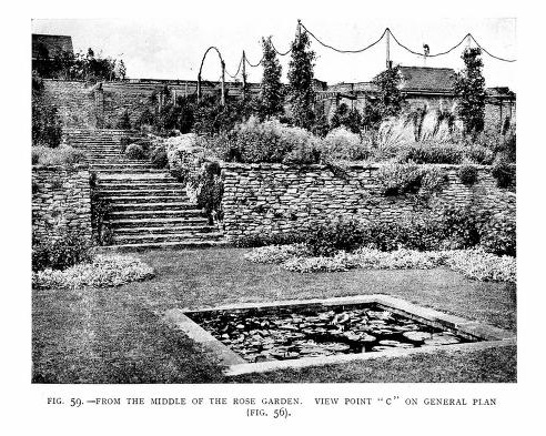 One of the features of Jekyll’s general plan of the garden is a rose garden, at the bottom of the slope with a water lily tank at one end, and a six foot high retaining wall running along the entire length, the top of which was planted with plants that would tolerate the free draining and exposed position. Jekyll says,
