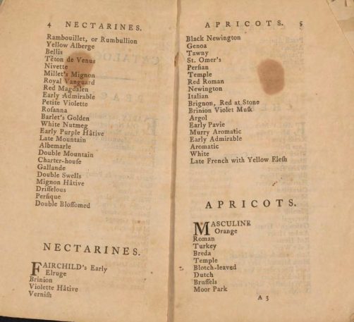 Back home, whilst considering the old fruit varieties I was delighted to come across a catalogue of fruit trees from the relatively local grower William Pinkerton, based in Wigan, and dating from 1782. Despite its fragile looking state it’s available at the Biodiversity Heritage Library via the U.S. Department of Agriculture’s National Agricultural Library. The comprehensive list includes a surprising number of peaches, nectarines and apricots as well as apples, pears, plums and cherries. Although not individually named, Pinkerton offers a staggering 74 varieties of gooseberry. It would be fascinating to know how many of these varieties are traceable today – the Green Gage and La Mirabelle plums certainly sound familiar. The catalogue is reproduced below.