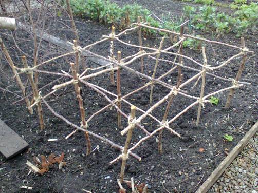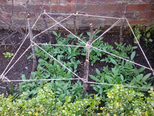 Beans and peas and other household vegetables are grown in open beds at the centre of the garden and the traditional supports for these made out of local materials such as birch are already in place for the coming season. Supports for flowers like peonies are also constructed using poles and string.