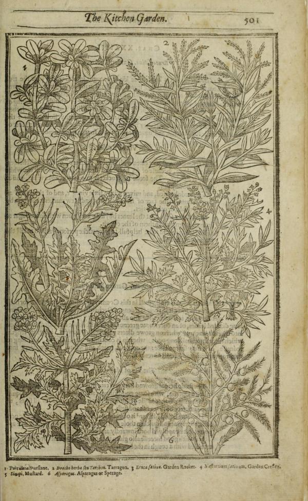 The following images show some of the staple vegetables that would have been grown in 17th century England such as cabbages, root crops like carrots and parsnips, onions and leeks, together with more exotic introductions like potatoes and melons. There are also indigenous wild plants like goat’s beard which are no longer grown for food. The complete text can be found at the Biodiversity Heritage Library – see link below.