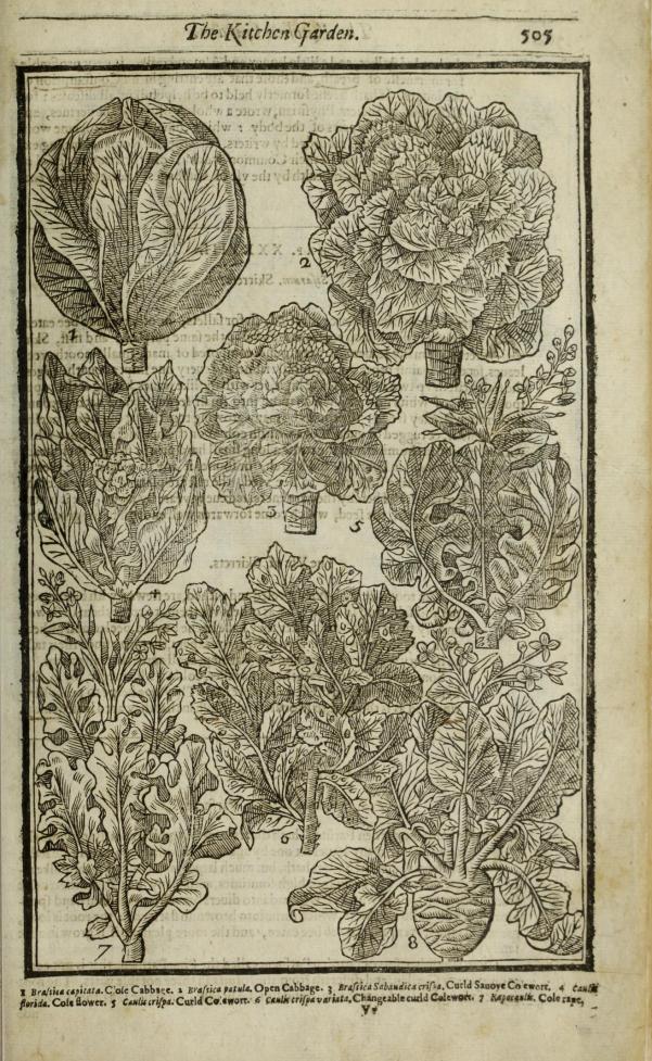 1. Brassica capitata Close Cabbage, 2. Brassica patula Open Cabbage, 3. Brassica sabandica crispa Curled Savoye Colewort, 4. Caulis florida Cole Flower, 5. Caulis crispa Curled Colewort, 6. Caulis crispa variata Changeable Curld Colewort, 7. Rapocaulis Cole Rape