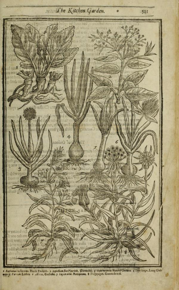 1 Raphanus rusticanus Horse Raddish. 2 Lepidium sine Piperitis Dierander. 3 copa rotunda Round Onions. 4 copa longae Long Onions. 5 Perrum Leekes. 6 Allium Garlicke. 7 Rapunculus Rampions. 8 Tragopogon Goates beard.