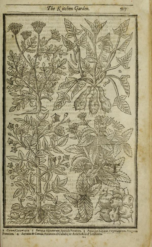 1 Carum Carawayes. 2 Battatas Hispanorum Spanish Potatoes. 3 Papas seu Battatas Virginianerum Virginia Potatoes. 4 Battatas de Canada Potatoes of Canada or Artichokes of Jerusalem.