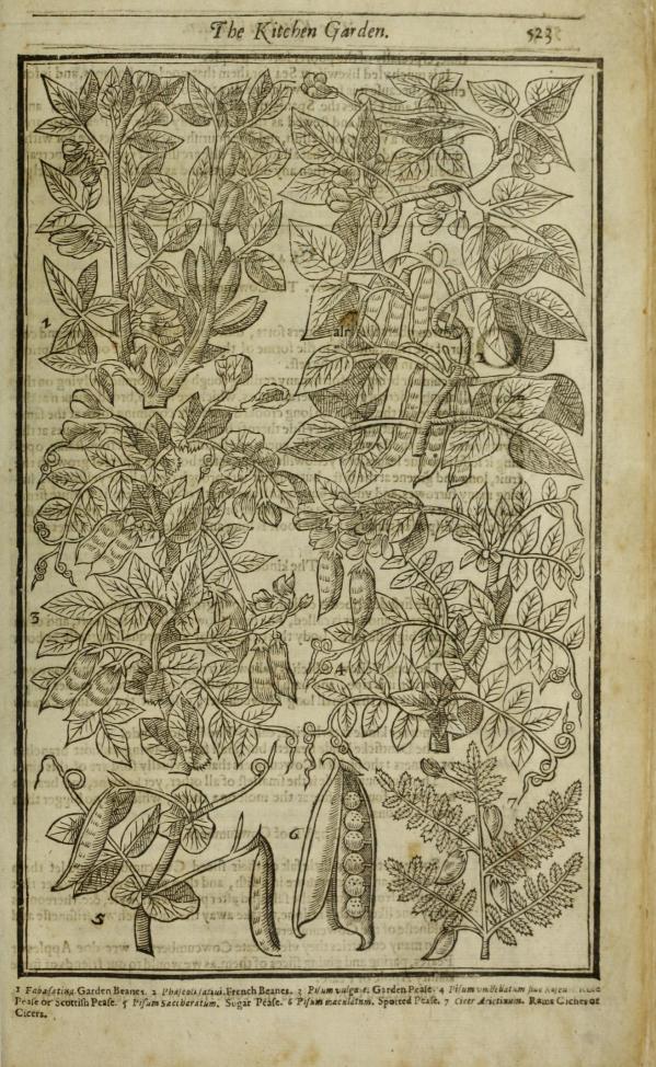 1 Fabasatina Garden Beanes. 2 Phasioli satsui French Beanes. 3 Pisum vulgare Garden Pease. 4 Pisum umbellatum sine Roseum Rose Pease or Scottish Pease. 5 Pisum saccheratum Sugar Pease. 6 Pisum maculatum Spotted Pease. 7 Cicer arictinuum Rams Ciches or Cicers