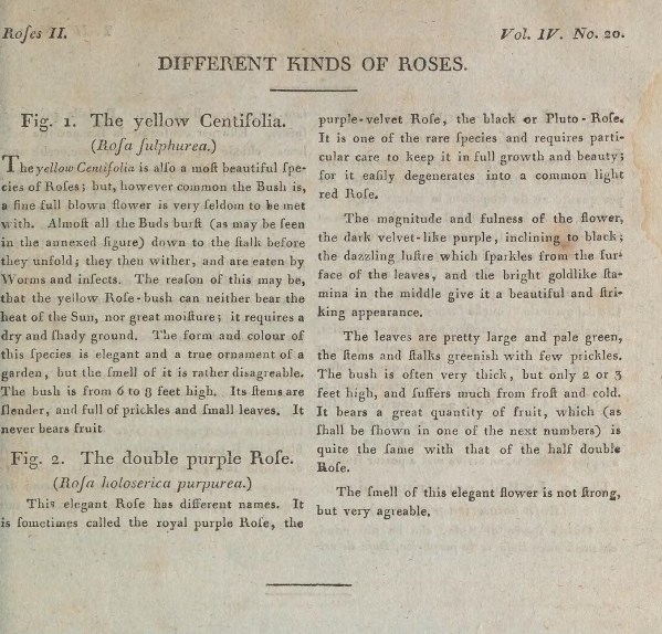 Fig 1. The yellow Centifolia (Rosa sulphurea), Fig 2. The double purple Rose (Rosa holoserica purpurea)