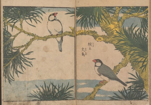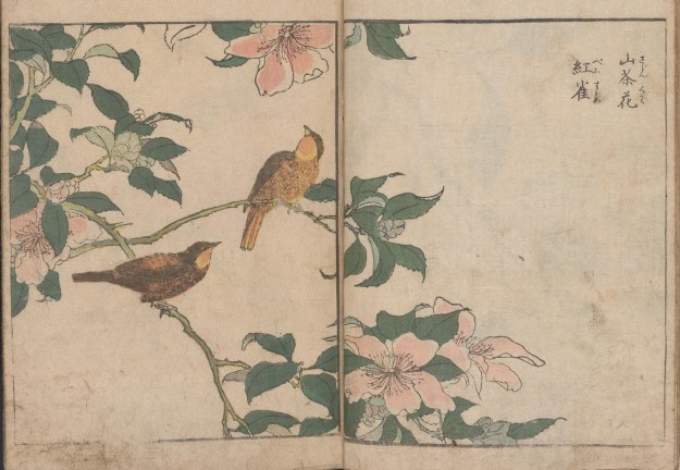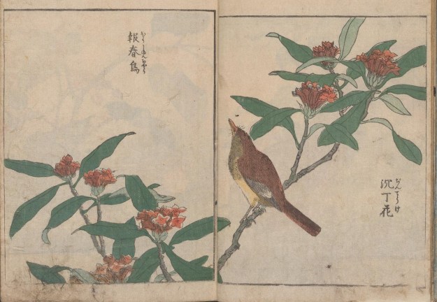 In Kacho shashin zui, an intriguing collection of early 19th century Japanese woodcuts, the branches of these flowering shrubs and trees form settings for some spectacularly beautiful birds. According to the British Museum, Kacho shashin zui translates as ‘Lifelike depictions of flowers and birds’. However, a quick internet search suggests that today the Japanese word ‘shashin’ can also relate to film, indicating a snapshot or photograph.