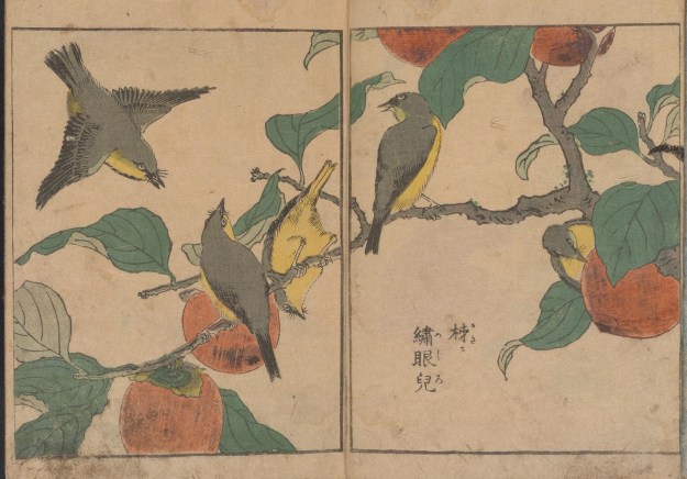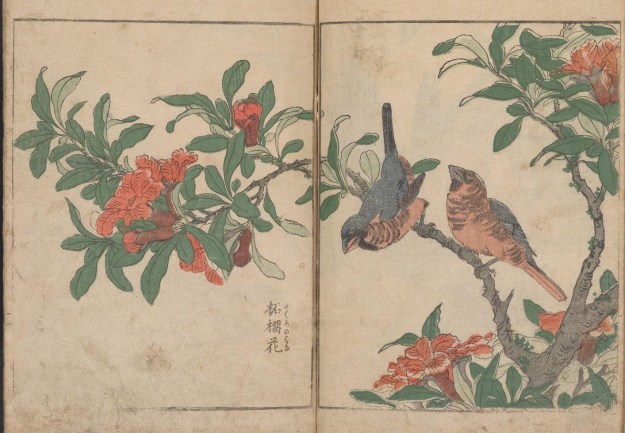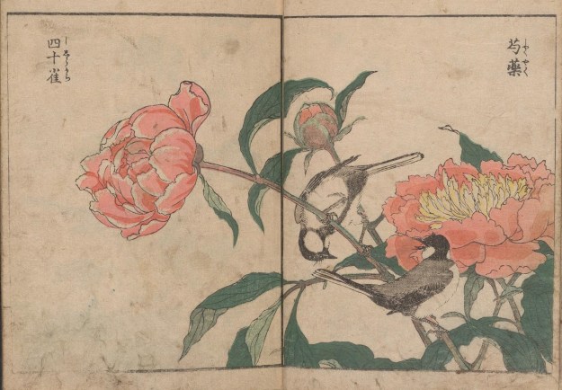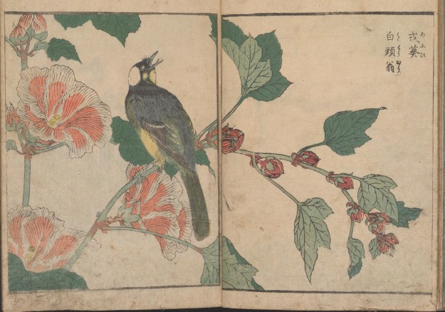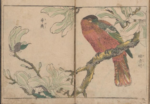 Kitao Shigemasa (1739 – 1820) was a print maker based near modern-day Tokyo, who, in a long career, produced illustrations for more than 250 books. The three volumes of Kacho shashin zui referred to here are from the Smithsonian Institute’s collection – and one of their delights (as well as the stunning woodcuts within) is to open their plain covers and experience the digital books opening left to right – links are below.