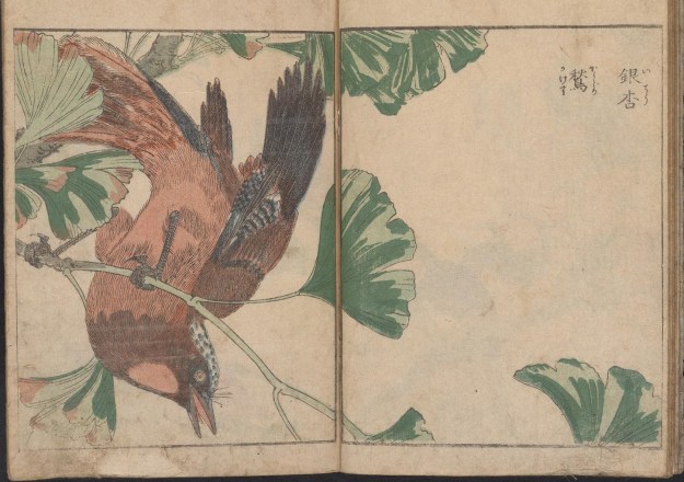 The composition of these woodcuts does indeed give them a photographic quality – they possess the immediacy of a close up shot. Typically spanning two pages, birds are shown perching on leafy twigs and sprays of blossom the edges of which are cropped by a rectangular black border. This has the effect of drawing us into the image, focusing our attention on the birds. In a striking image of a jay hanging upside down in a gingko tree, only one of the leaves is shown in its entirety, the rest are cut through by the frame of the image.