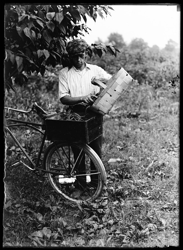 The collective title devised by library staff for these photographs is ‘Farm, harvesting vegetables’, and it’s unclear if the harvesters are collecting vegetables as workers employed on a farm, or for their own use. It’s interesting to see that, unlike today, the baskets, boxes and cloth sacks they are using are all made out of natural materials rather than plastic.