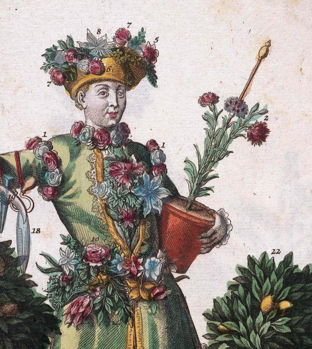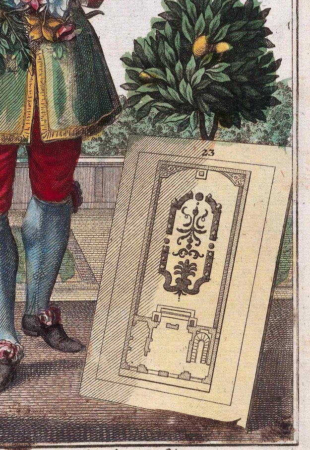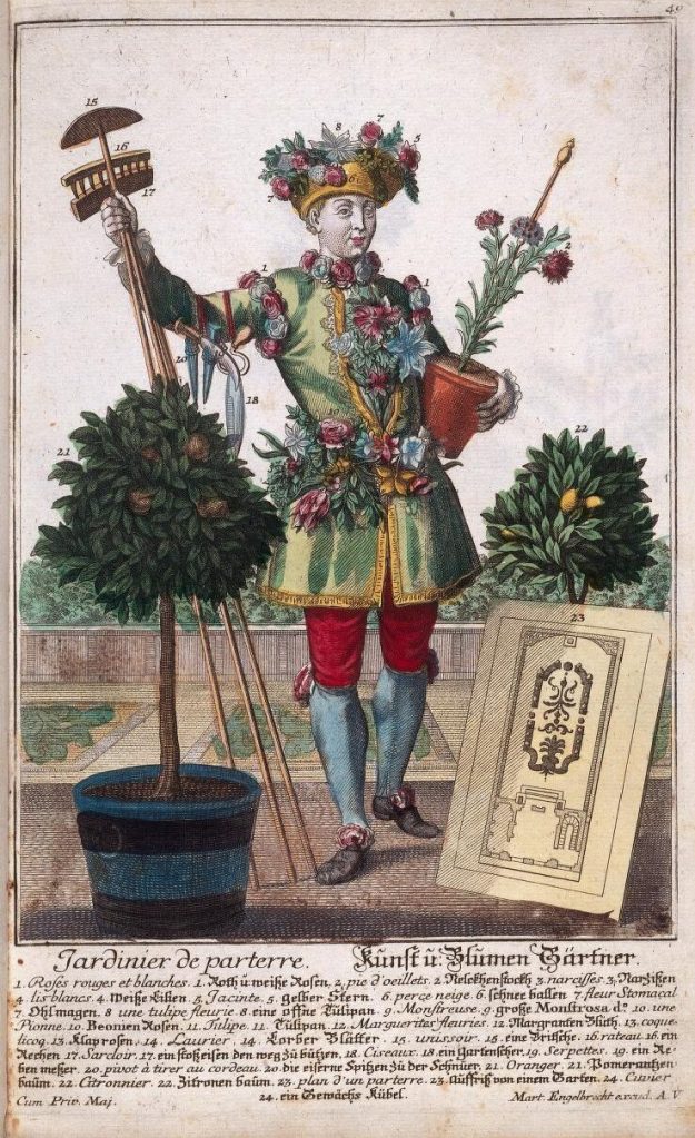 Our parterre gardener is dressed in a smart green jacket, edged with lace and gold brocade – perhaps a costume in which to meet clients rather than engage in hands-on gardening. Flanked by two citrus trees in containers, he is located in a walled garden containing three precisely constructed parterre beds, demonstrating the quality of his work.