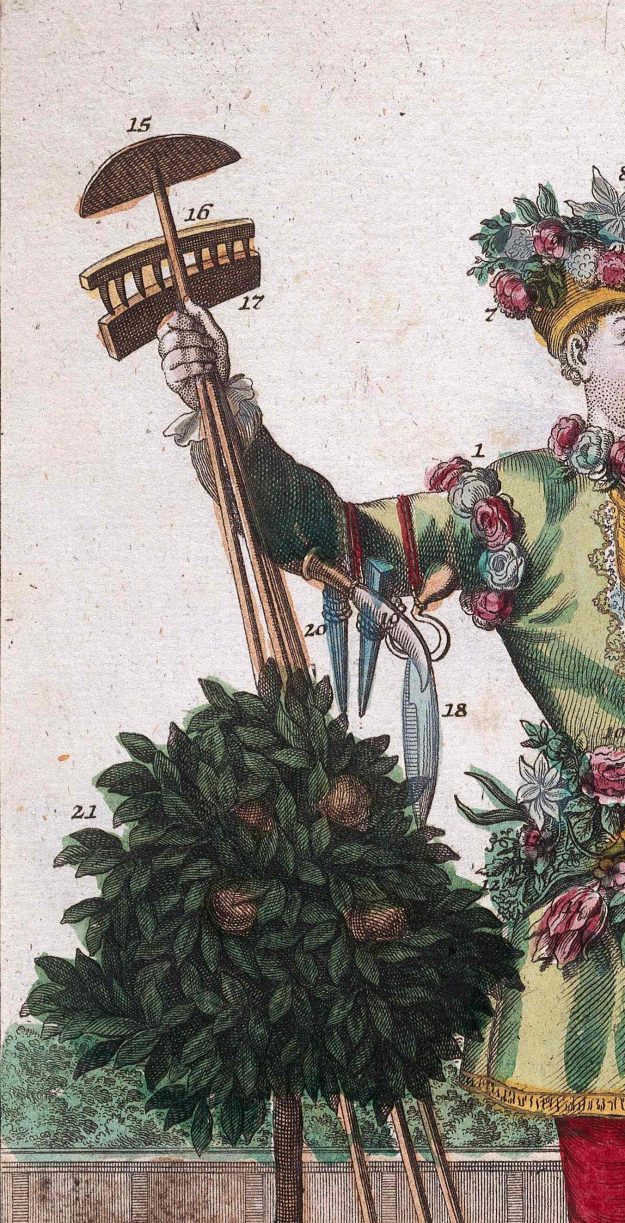 His tools include a rake, a hoe and an edger, while suspended from the arm of his jacket are pegs for laying out parterre designs, a pocket knife, a sickle and gardening scissors – all used for pruning and shaping plants before the invention of the secateurs and lopper.