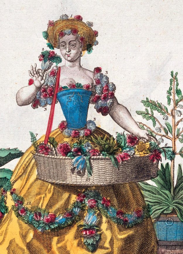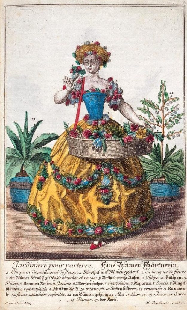 Most of Engelbrecht’s tradespeople are accompanied by their wives, also wearing costumes incorporating elements relating to their husbands’ businesses. The parterre gardener’s wife is dressed in a vibrant yellow dress with a blue bodice, shaped to resemble a flower pot. Her basket is full of flowers, broadly similar to those worn by her husband, but with the addition of a sunflower (perhaps to complement the colour of her dress) and the herb marjoram. Next to her, in wooden containers, are fine examples of an aloe and a flowering yucca plant.
