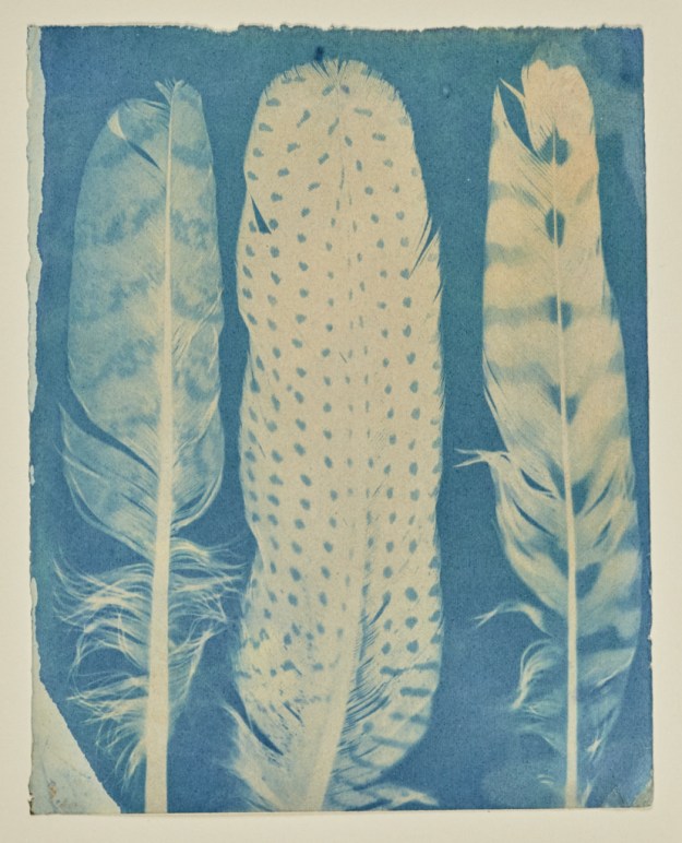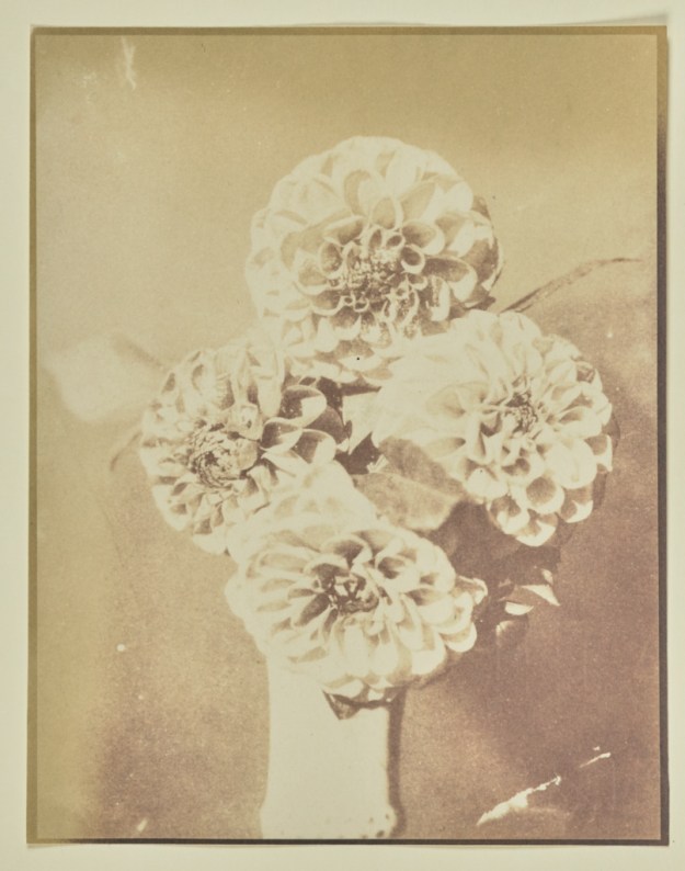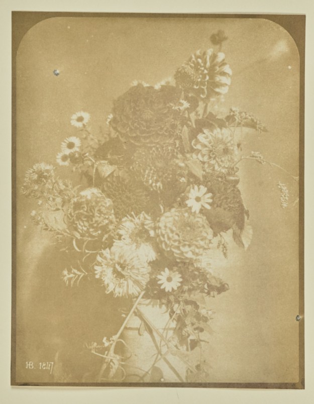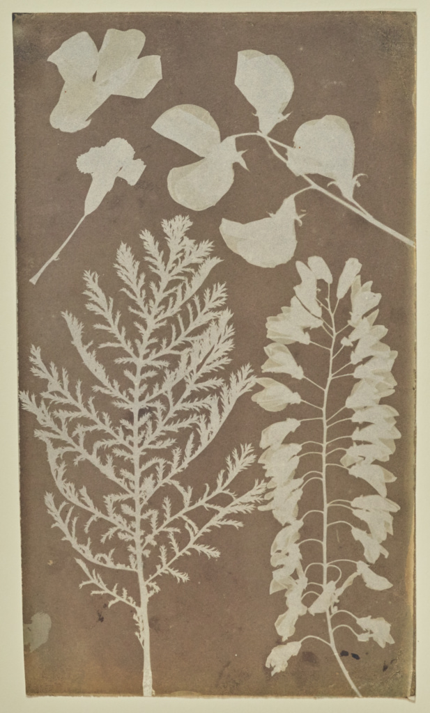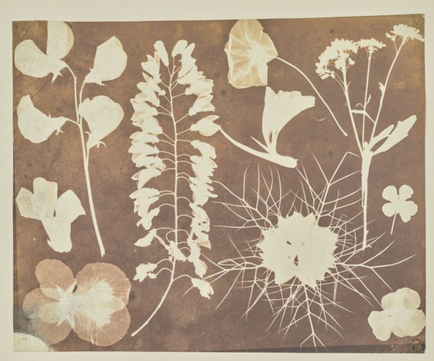 Bayard’s interest in the natural world is clear from his earliest photographic impressions made in the 1830s using salted paper prints and cyanotypes.  He takes great care in the arrangement of plant specimens, feathers, fragments of cloth and lace.  A long raceme of wisteria flowers looks elegant placed next to a leaf with a similar form, while in another image Bayard uses a range of different shapes – the spiky structure of a nigella flower contrasting with the softer outlines of sweet peas and nasturtiums.