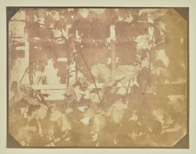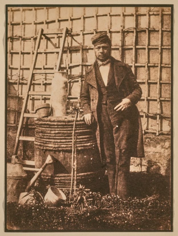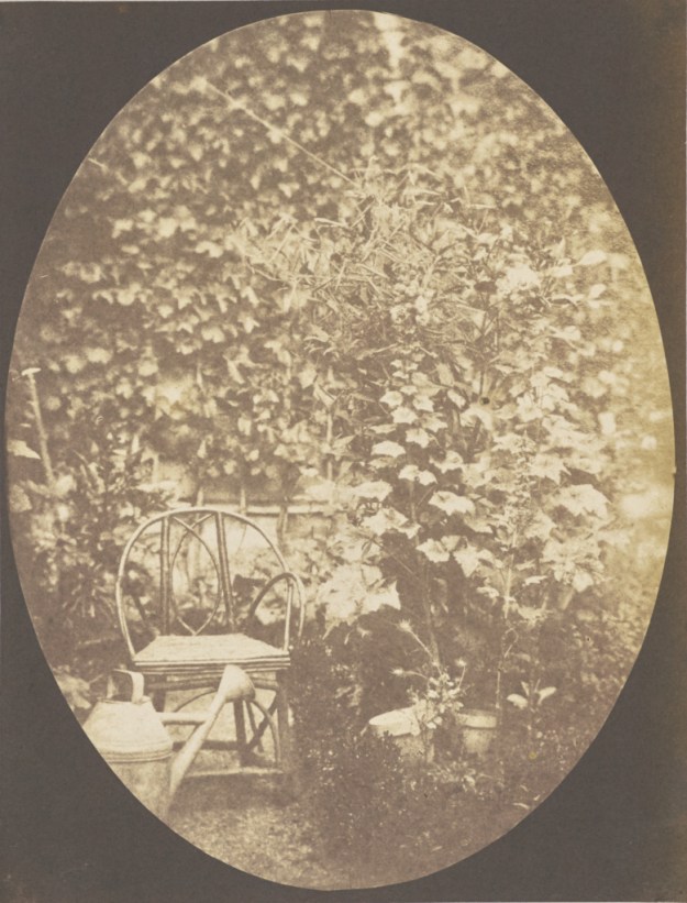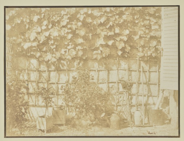 A strong sense of composition is evident in ‘Self-portrait in the garden’ (1847).  The photographer leans on an enormous barrel, on top of which a tall ceramic vessel is placed, creating a connection between these two bulky objects, while a simple wooden ladder, balanced against the garden wall, adds more height and balance.  If we look closely at the slightly irregular grid of the rustic trellis forming a background to the photograph, stems of a climbing plant are visible, trained along its structure.  At ground level we see various terracotta pots, a watering can, as well as low-growing, evergreen plants – probably box – edging the borders.  As well as plants, Bayard appears to have appreciated the objects and paraphernalia of gardening.