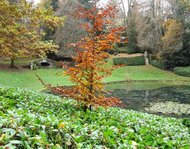The gardens are meticulously maintained.  Fallen leaves on the lawns and pathways at Rousham are allowed to remain while they retain their colour, and massed evergreen shrub plantings are pruned carefully to the same height, creating large organic forms that complement the overall landscape design.  Precise judgements like these are fundamental to preserving the particular atmosphere of these gardens.