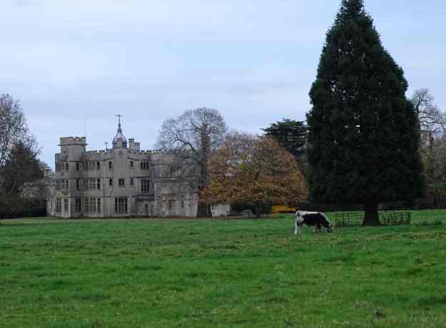 Rousham House from the park, with a member of its herd of longhorn cattle