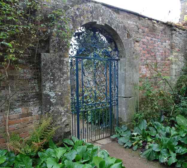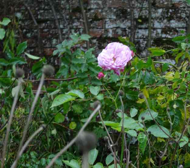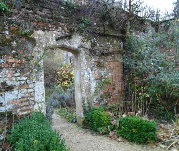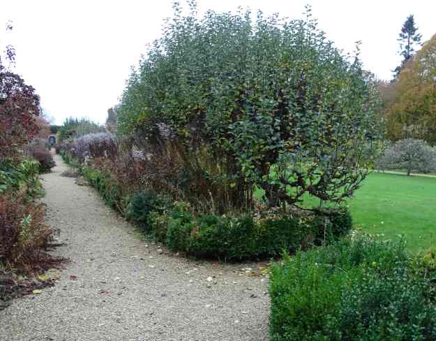 Silvery and shimmering, a rill winds its way through the trees, punctuated at one point along its course by a deep stone clad pool of clear water, the Cold Bath.  From the bowling green next to the house we passed through an archway cut through an enormous yew hedge to the gateway of the walled garden.  Planted with fruit trees and wide, generous herbaceous borders, the very last of the roses were still flowering.  Beyond is the 17th century dovecote and the parterre garden.