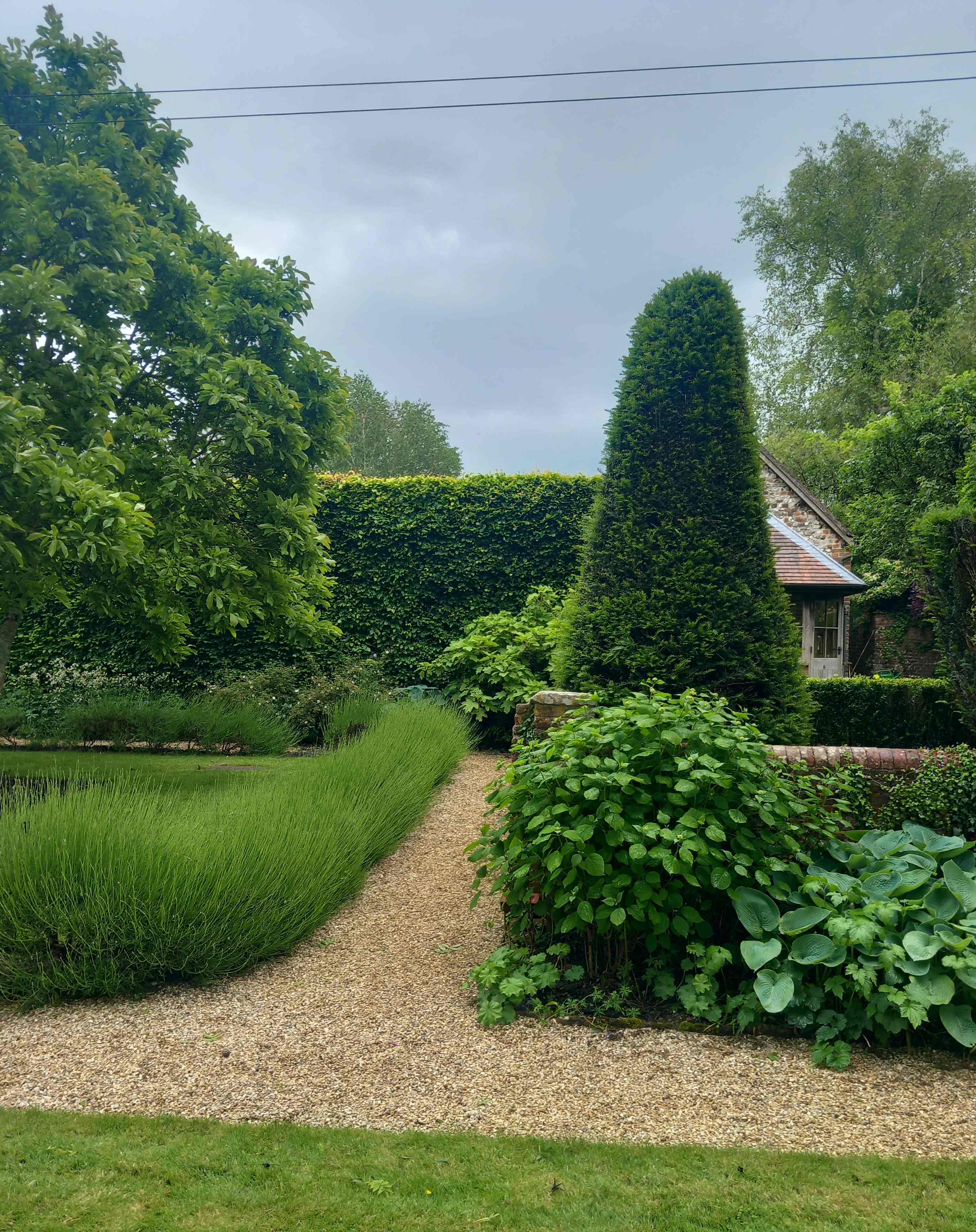 Passing through an opening in a tall beech hedge, gravel paths lead past the spreading canopy of a Magnolia soulangeana to an area enclosed by a box hedge and planted with flowers and roses. This was formerly the vegetable patch, until the 1980s. Beyond this is a knot garden with herbs, and topiary frames a view of St Mary’s church.