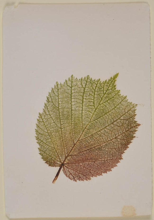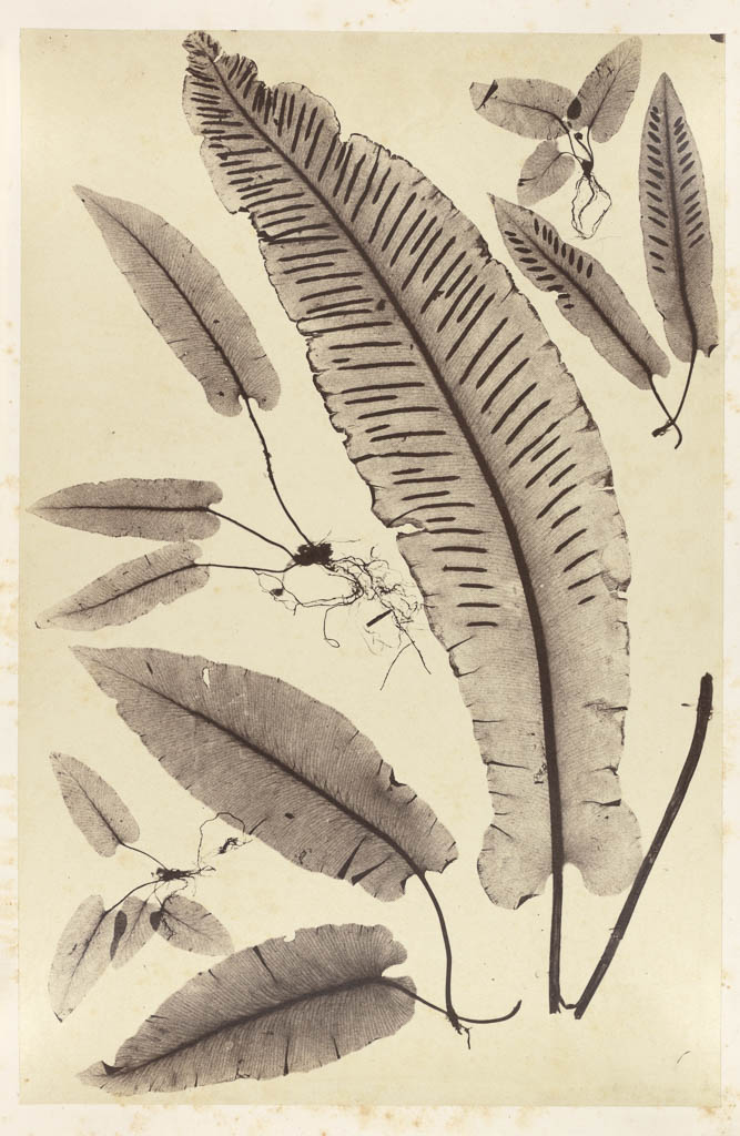Hart’s-tongue fern. Composition including sporelings, ‘enlarged’ composition. Albumen print from a photogenic drawing contact negative.