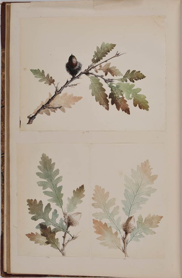 Although Cecilia Glaisher’s fern photographs weren’t published, they were preserved by her children and her son James presented them to The Fitzwilliam Museum in 1928 with some of her snowflake drawings and a series of highly accomplished nature prints depicting leaves and ferns.  One of the limitations of nature printing is that it works best with flat objects and in a series of images showing oak specimens Glaisher has addressed this by adding hand drawn details of branches and acorns.