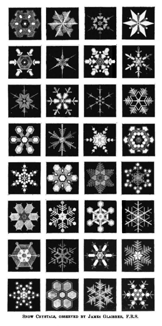 We can only think that the collapse of the fern project must have been a disappointment to Cecilia Glaisher, but fortunately there was another opportunity waiting for her.  Together, the Glaishers produced a series of one hundred and fifty illustrations of snowflakes for James Glaisher’s research paper for the Meterological Society, On the Severe Weather at the beginning of the year 1855: and on Snow and Snow Crystals.  James’s initial sketches of the individual snowflakes, observed through lenses from their house in Blackheath, were re-drawn and enlarged by Cecilia in a clear, diagrammatic style.  Cecilia also produced photographic copies of James’s snowflake drawings using salt prints.