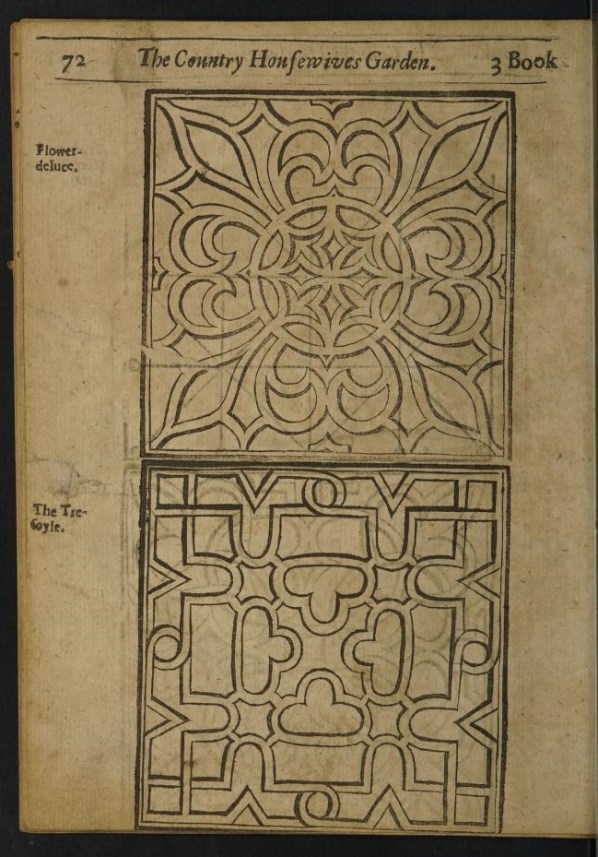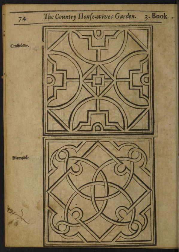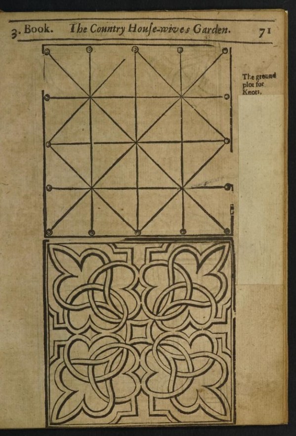 If you are curious to know what a knot garden looked like in a smaller domestic garden of the early 17th century, The Country House-wives Garden (1618) by William Lawson gives some intriguing insights into the vast range of designs, and plants that were used. Lawson includes in his book several knot patterns which could be followed or used as inspiration for an individual’s own design, remarking that ‘they are as many, as there are devices in Gardeners brains’.