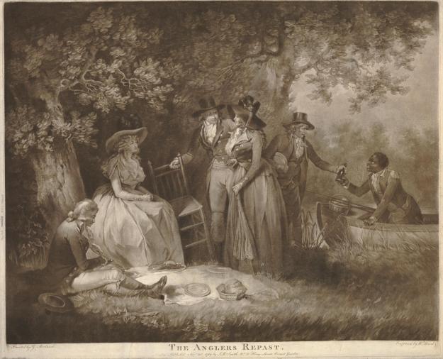 It was this atmosphere of idealised rural simplicity that wealthier classes wished to re-create, although their version of Le Repas Champêtre was activity of leisure, rather than a daily necessity.  An English print entitled The Anglers Repast (1789), shows a well-dressed group setting up their outdoor meal helped by a black servant, who is unloading their boat and passing a bottle of wine to one of the guests.  The use of the word ‘repast’ suggests a modest meal appropriate for a working fisherman, but the presence of a servant, the group’s clothes and the household chairs transported for the comfort of the female guests all indicate this fishing excursion is entirely for pleasure.
