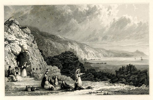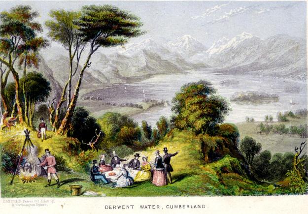 In Derwent Water, Cumberland (1849) by George Baxter (1804 – 1867) it’s not difficult to imagine William and Dorothy Wordsworth at a gathering like this with their circle of literary friends  – which was doubtless what Baxter had in mind when he produced this souvenir of Cumberland, a destination popularised by Wordsworth’s poetry and cultural commentaries.  The group’s lively conversation is significant, hinting at the importance to the Romantic Movement of group excursions like these as an opportunity to exchange ideas, as well as to appreciate the views.