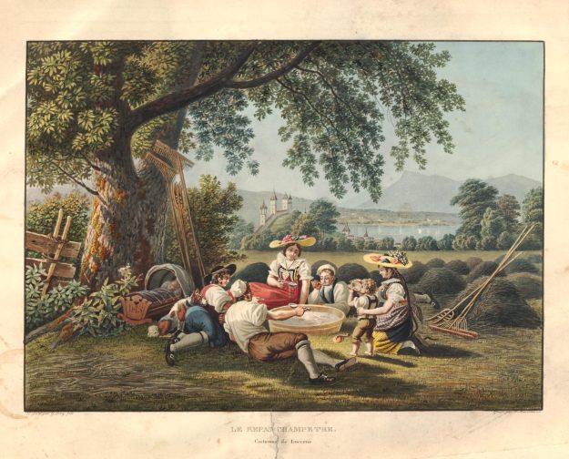 Another French term for a shared meal, which took place outdoors in a rural setting, was Le Repas Champêtre.  This gathering was open to women and children, as well as men.  In Le Repas Champêtre / Costumes de Lucerne (1820s), by the Swiss artist, Gabriel Lory le fils, a group of agricultural workers in traditional dress share a meal under a tree on the edge of a hayfield, surrounded by their rakes.  It’s likely the women are also working, perhaps taking it in turns to look after a baby and toddler under the shade of a large tree.