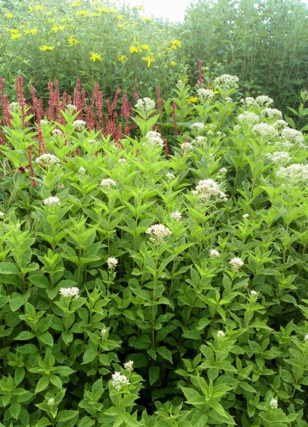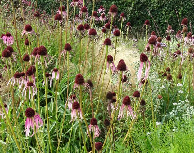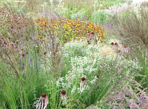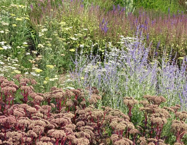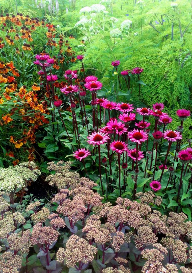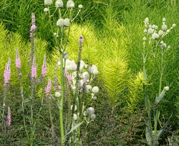 In other areas, blocks of perennial flowers with rounded shapes like sedums (Hylotelephium), echinacea, helenium and various umbellifer species form a pleasing contrast with the flower spikes of persicaria, lythrum and perovskia.