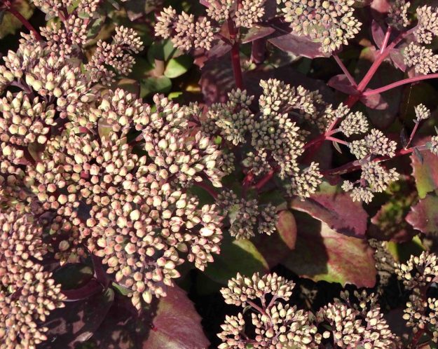 Contrast of texture and colour with purple Hylotelephium (sedum) in foreground, the yellow grass Carex elata ‘Aurea’ behind