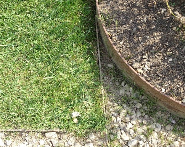 Detail of corten steel edge to the borders juxtaposed with gravel and lawn