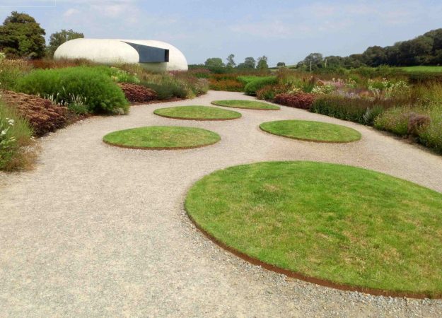 Oudolf’s gardens are designed to reach their peak from late summer through autumn, and the plants are left to die back naturally – their structures providing winter interest and acting as a seedbank for birds.  In February and March everything is cut back to ground level and the growth cycle begins again.  Perhaps it is not intentional, but sculptor Richard Long’s Stone Circle (1980) located close to the pavilion seems to echo this circle of life theme.