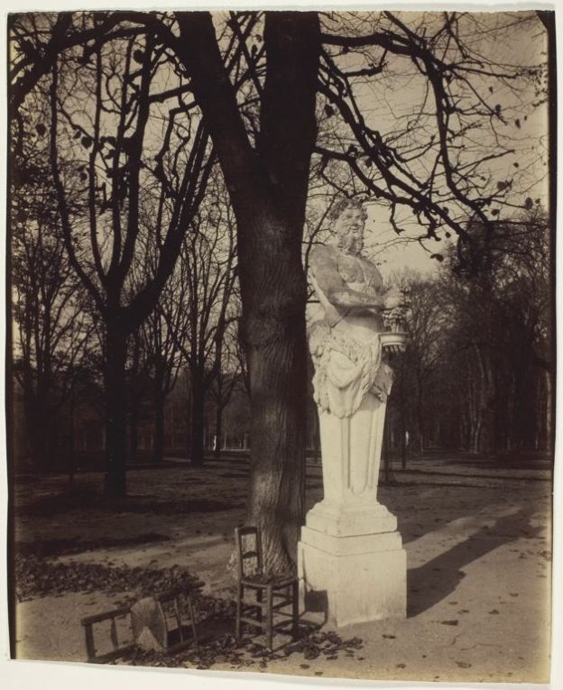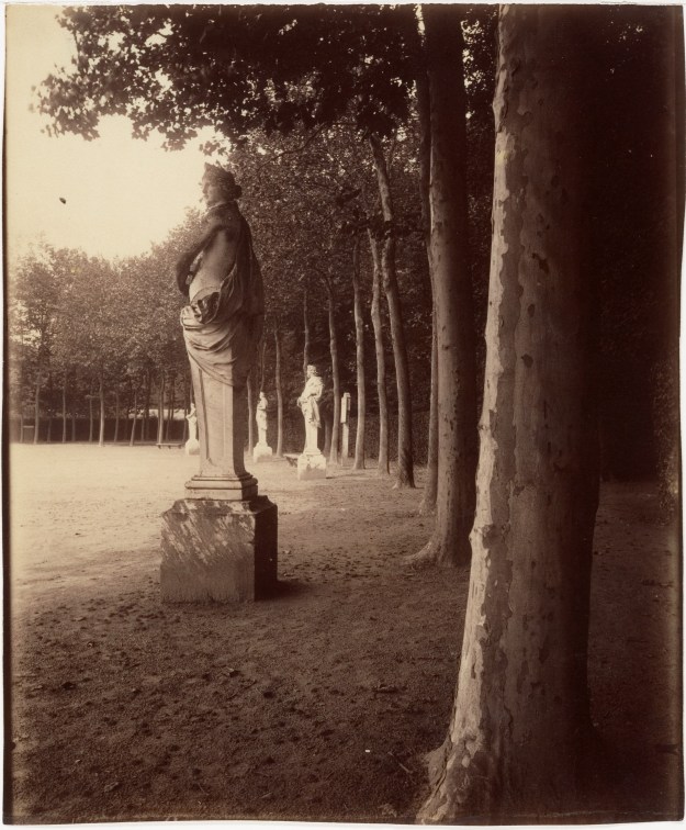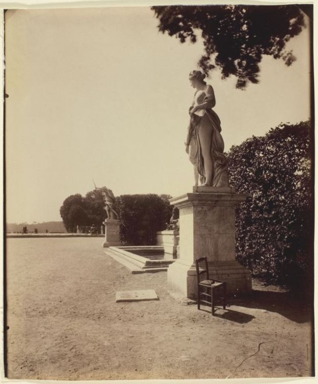 People are noticeably absent in Atget’s Versailles, giving the gardens a slightly mysterious feel. But closer inspection shows a flower bed has been stripped out and awaits new planting – suggesting that gardeners have recently been at work here. And what of the abandoned chairs which frequently appear next to the statues? The sculptures form a strange but intriguing juxtaposition with these domestic scale chairs, and Atget seems content to leave the chairs randomly placed, as he finds them, allowing them to suggest a narrative. Who last sat here? And how did one of the chairs come to be overturned?