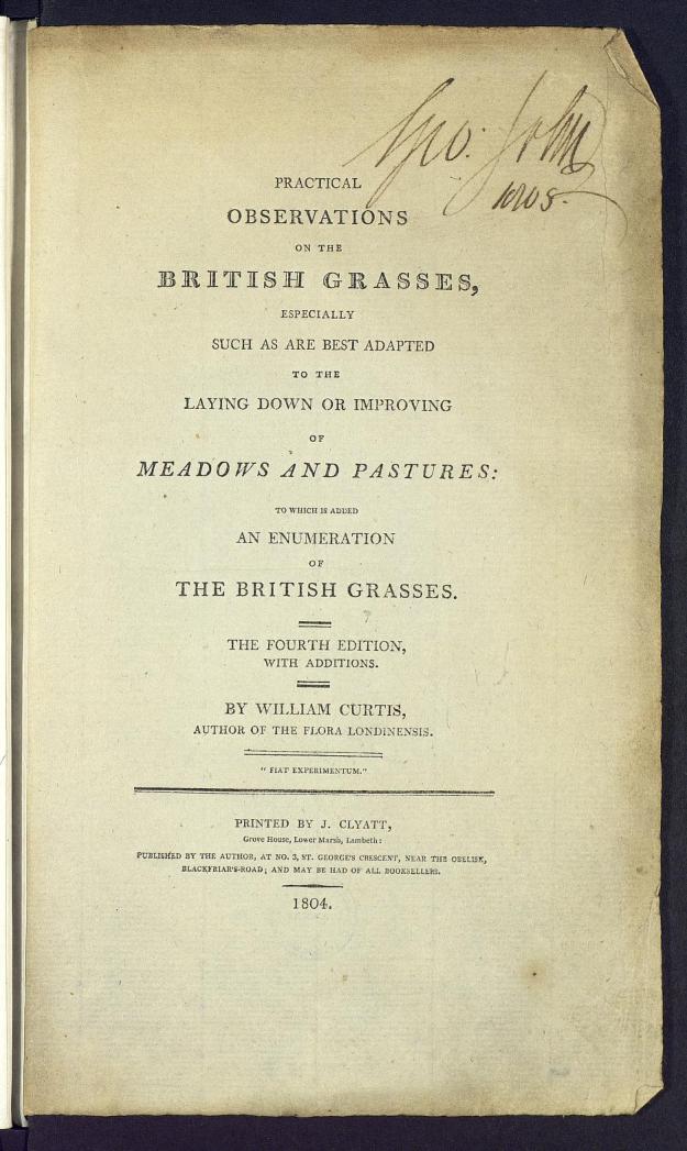 Curtis published Practical observations on the British grasses: especially such as are best adapted to the laying down or improving of meadows and pastures: to which is added an enumeration of the British grasses in 1790. Purchasers of the pamphlet (priced at ten shillings and sixpence) were entitled to a special packet of grass seeds, with which to establish their own meadow.