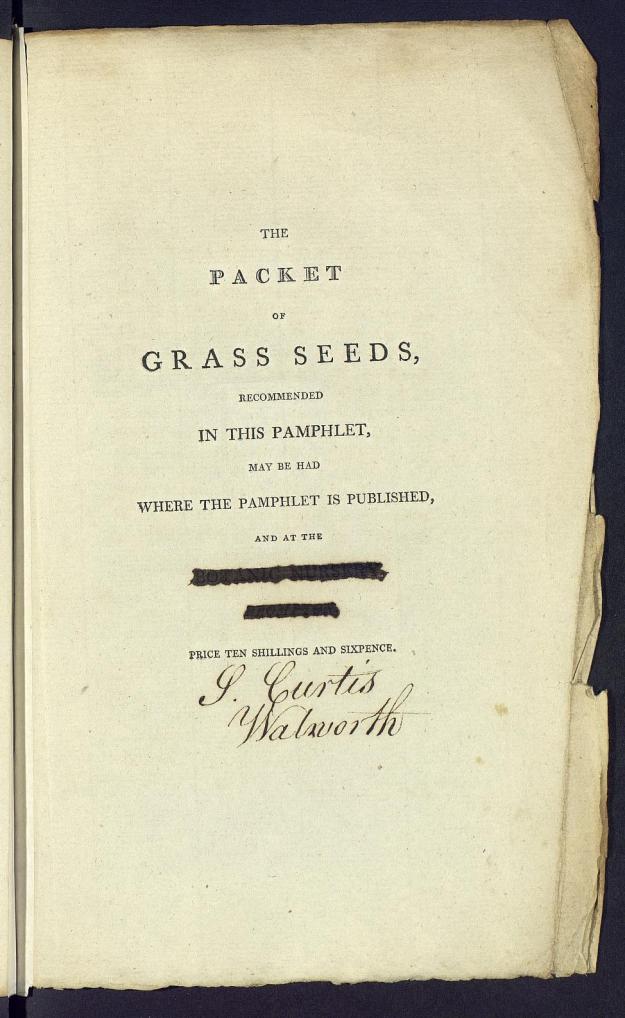 At the beginning of the pamphlet William Curtis expresses exasperation that the only grass seed available commercially for sowing pasture or meadow is Ray-Grass, which he says is widely accepted to be inadequate for the purpose. Curtis discusses the virtues of a range of grasses, finally recommending six native to England which he believes to be the best.