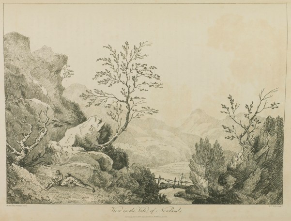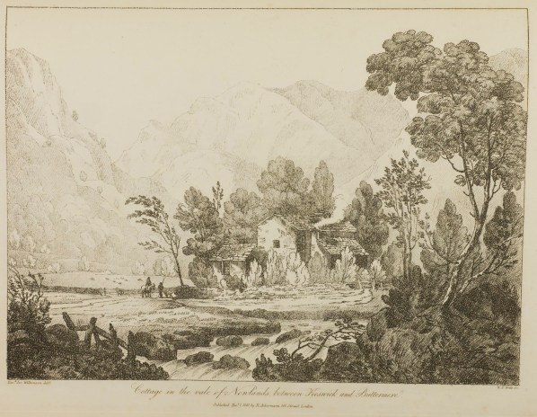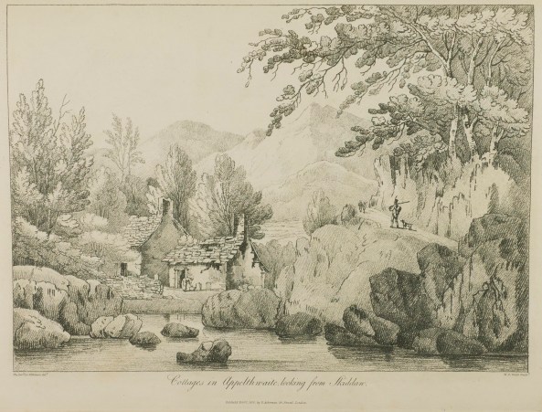 Many of Wilkinson’s engravings (which Wordsworth is said to have disliked) do show people, although the figures don’t integrate particularly well into the mountainous landscapes.  Wilkinson’s cottages (and gardens) are more successful, however, showing some of the character Wordsworth admired, and recording a way of life that was already disappearing with the advances of the industrial revolution.
