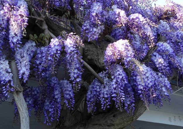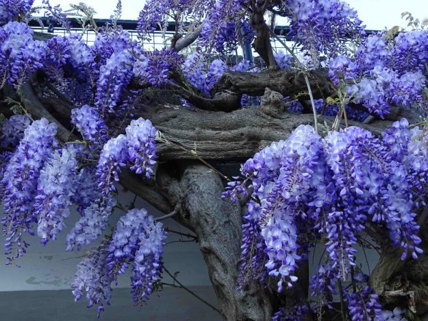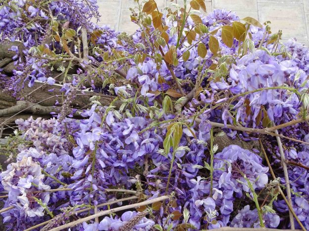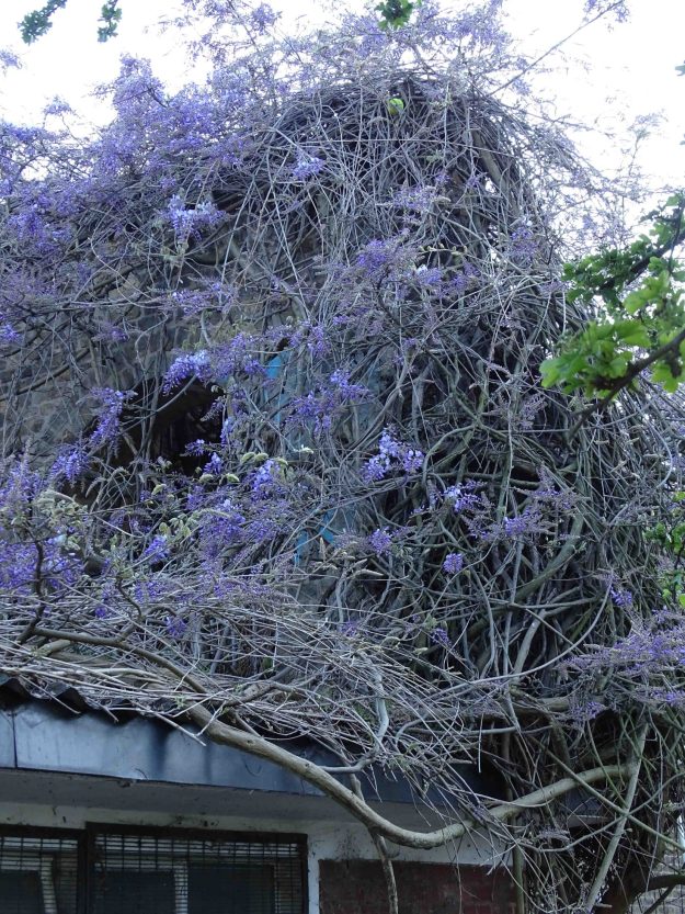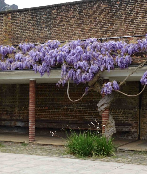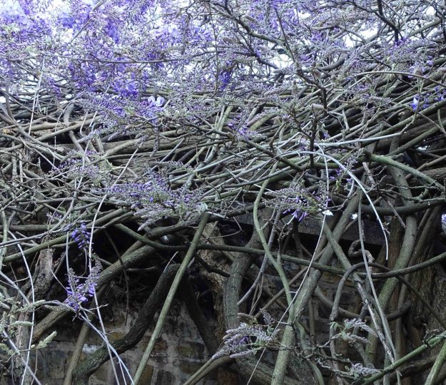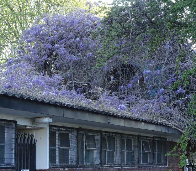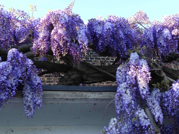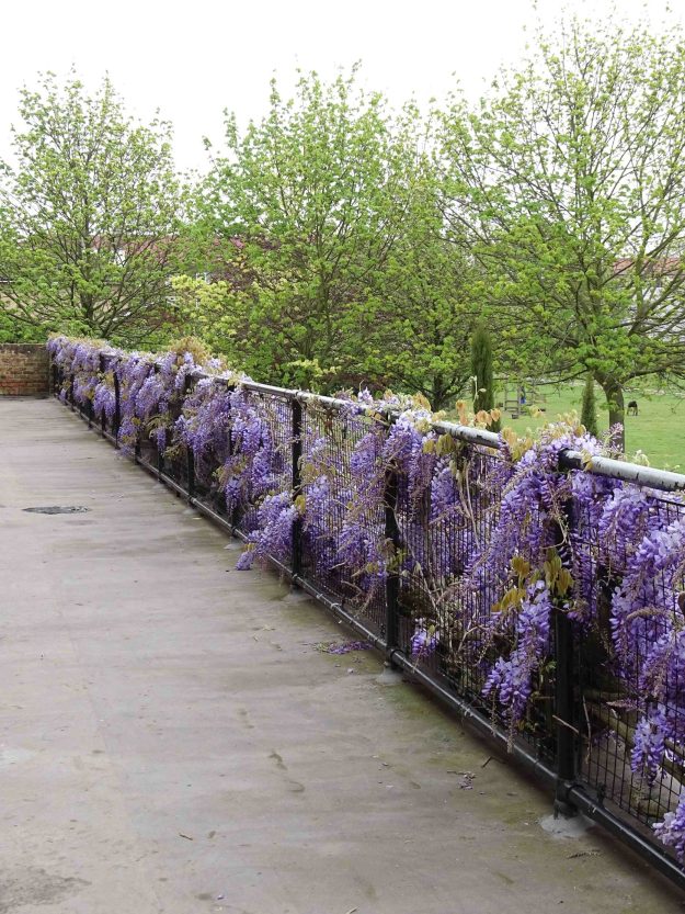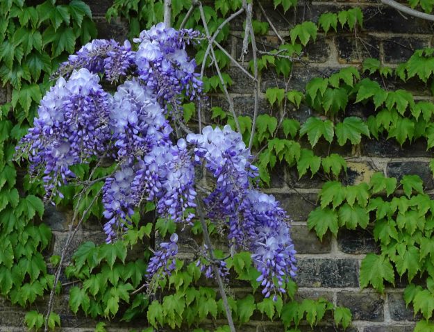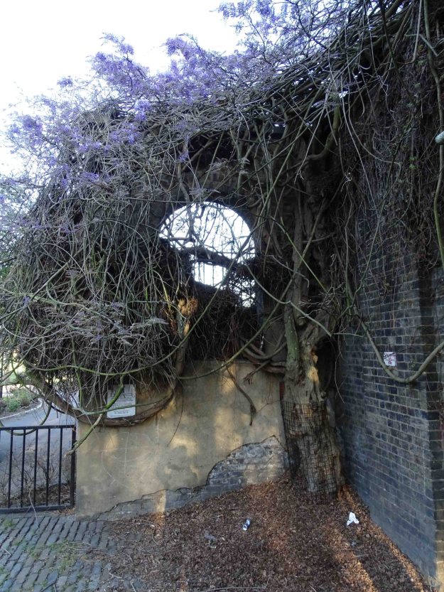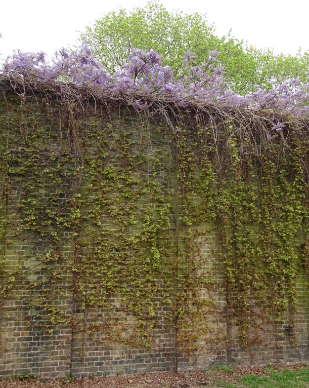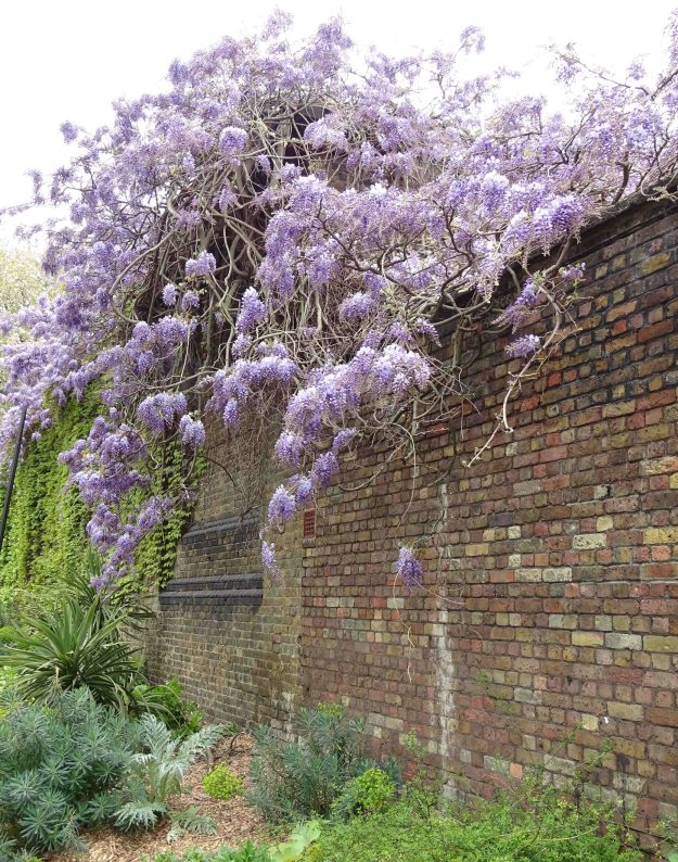 These park walls are large enough to accommodate such a specimen, but show just how vigorous wisteria plants are and how large they can get without regular pruning – if this was a residential street, a row of terraced houses would now be submerged in such a profusion of growth.