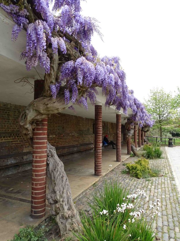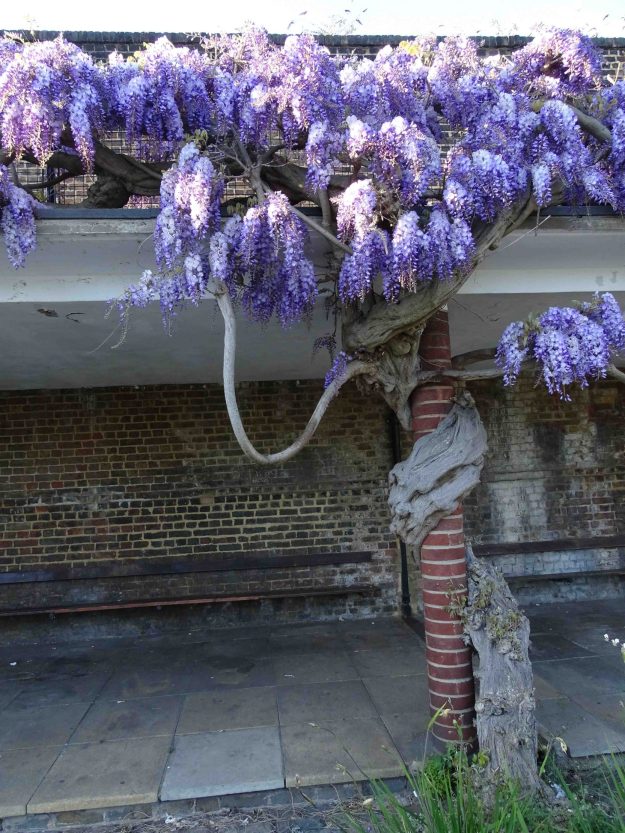 On the north side of the park, bounded by Whiston Road, there’s a long pergola walk and three of the wisterias are located here – their immense stems curling up slim brick columns. As the winding growth of these plants joins together and spreads out above these columns, at this time of year the flowers cascade down along the entire length of the structure.