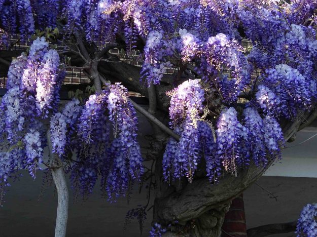 The arch in the wall is just visible through the profusion of wisteria stems and flowers