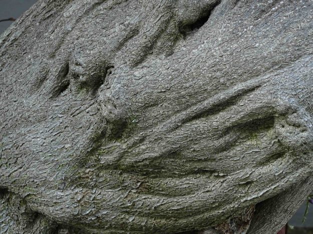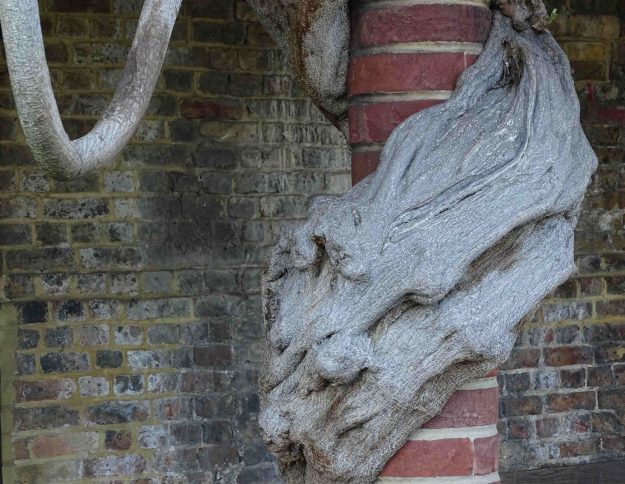 The trunk of an un-pruned wisteria on a high wall in the centre of the park
