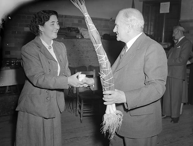 llgc-id-1474341 ← Previous Next → Chirk Women’s Institute Harvest Home, including images of women and some men at long tables enjoying refreshments, receiving prizes for their vegetables and flower arrangements, and vegetables being judged 1st September 1954